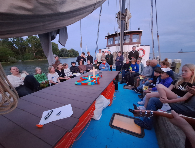 Tag 5: Relativ ruhiges Segelwetter war vorhergesagt, es sollte anders kommen. Durch die Schleuse aufs Markermeer nach Hoorn. Auf dem Weg dorthin frischte der Wind heftig auf. Böen bis Windstärke 7. Die Boote lagen schräg im Wind. Auf dem kleineren Jugendboot blieb keiner trocken und auch auf der größeren Grietje reichte das Wasser bis an die Fenster der Kabinen, Tische und Stühle rutschten unter Deck aus ihrer ursprünglichen Position. Niemand wurde seekrank, (fast) alle hatten ihren Spaß, vertrauten den Skippern auf beiden Booten und wir erreichten sicher den Hafen von Hoorn. Dort hieß es langsam Abschied nehmen, gemeinsames Grillen mit beiden Mannschaften und den Skippern, Gottesdienst feiern. Die Jugendlichen dichteten kreativ ein bekanntes Lied um, die Erwachsenen bemühten Künstliche Intelligenz für Predigt und ein Lied über die Woche. Die Texte beider Lieder und das KI-generierte Lied sind auf der Homepage des Kirchenkreises zu finden.