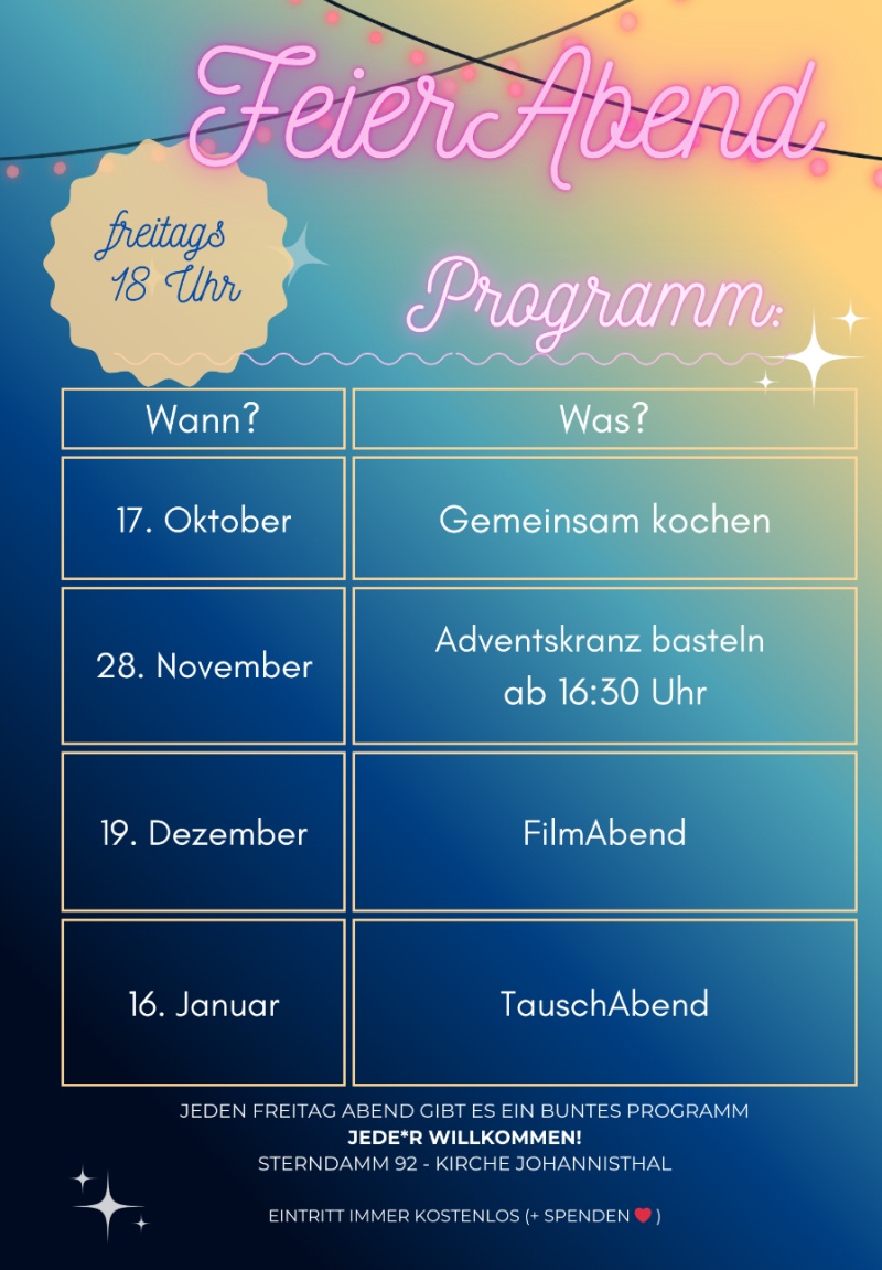 Auch wenn die Tage kürzer und die Abende länger werden – unser FeierAbend bleibt bunt und lebendig! Einmal im Monat wollen wir zusammenkommen, um gemeinsam Neues auszuprobieren, miteinander ins Gespräch zu kommen und die Gemeinschaft zu genießen.